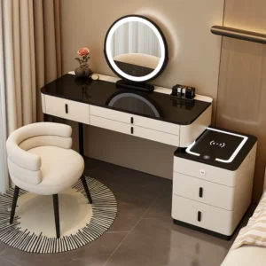 Das AURORA & PEARL Schminktisch-Set verbindet zeitgemäßes Design, intelligente Technik und hohen Sitzkomfort in einer eleganten Lösung für Ihre tägliche Beauty-Routine. Mit großzügiger Arbeitsfläche, moderner LED-Beleuchtung und smarten Ladefunktionen wird jede Pflege- und Styling-Session zum angenehmen Erlebnis.