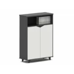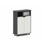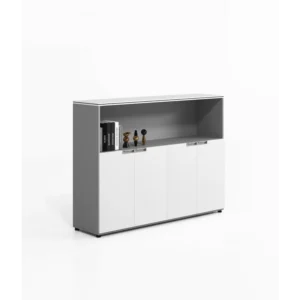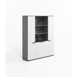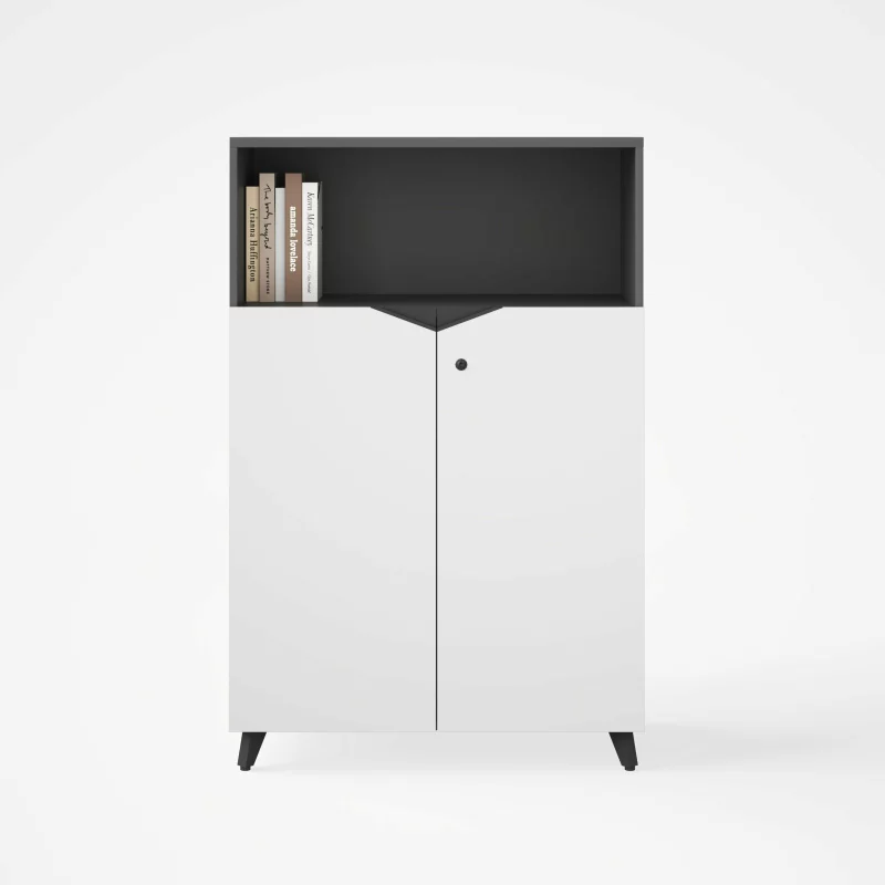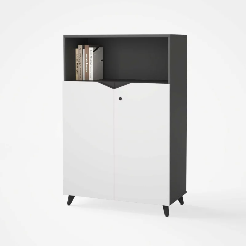 Das Möbelstück verfügt über zwei geschlossene Fächer mit Türen für vertrauliche Unterlagen sowie ein offenes Regal im oberen Bereich, das sich perfekt zur Präsentation von Büchern, Magazinen oder Dekorationsobjekten eignet.
