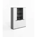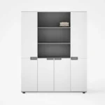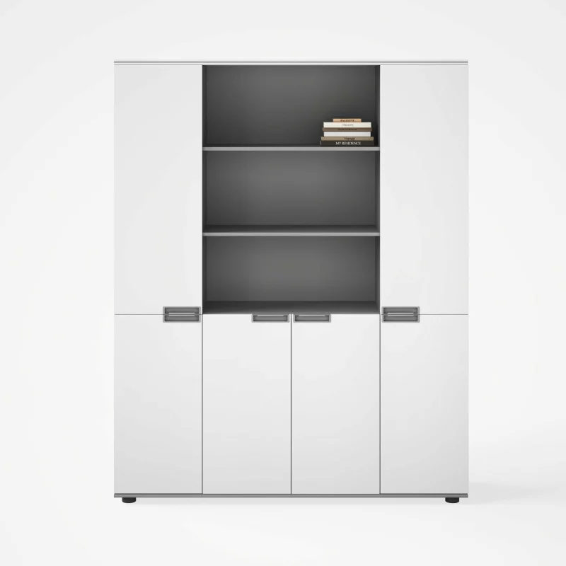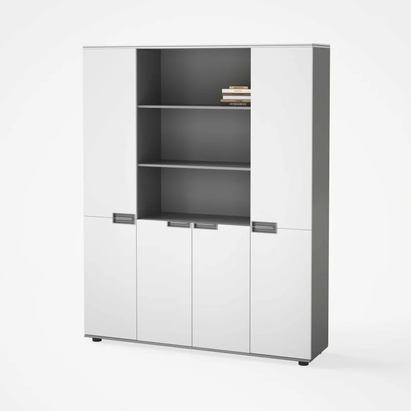 Im unteren Bereich befinden sich vier geschlossene Türen, die ausreichend Platz für Dokumente, Akten und Büromaterial bieten.