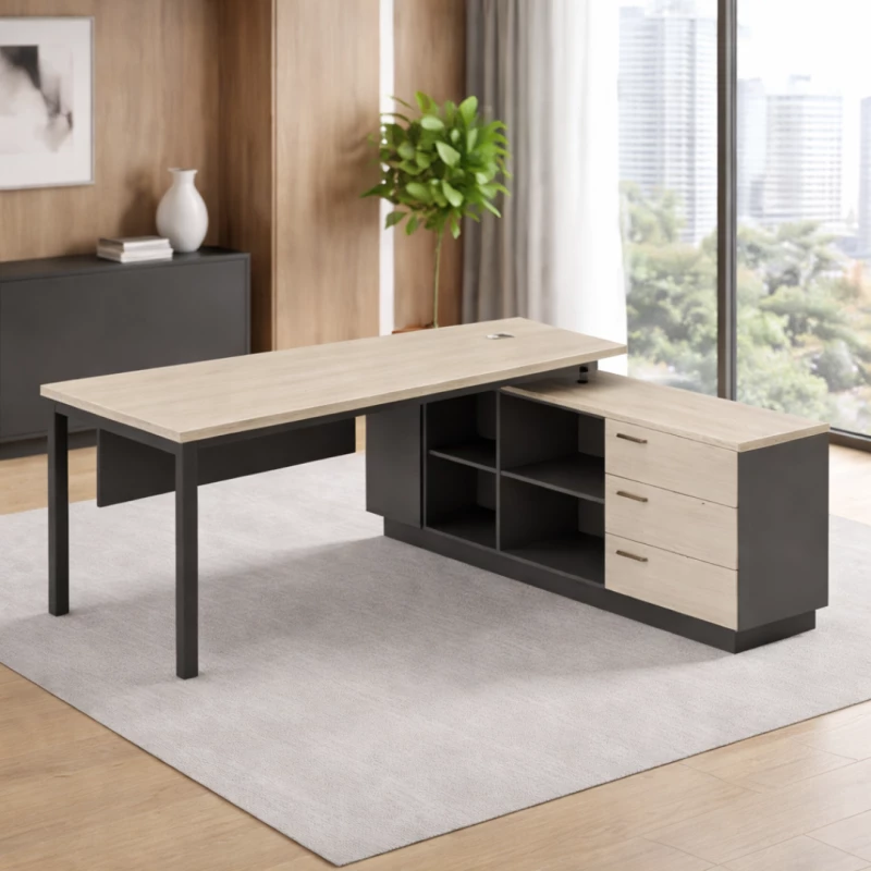 Dieser Chefschreibtisch mit Metallbein und integriertem Sideboard ist eine praktische und elegante Lösung für Executive-Büros, Managementarbeitsplätze und moderne Unternehmensumgebungen. Die Kombination aus großzügiger Arbeitsfläche, stabilem Metallgestell und integriertem Stauraum sorgt für eine effiziente Organisation des Arbeitsplatzes und ein professionelles Erscheinungsbild.