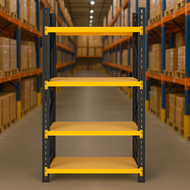 Schwerlastregal aus Stahl – 1085 x 600 x 2000 mm – 4 Ebenen – 800 kg Tragkraft – verzinkt & gelb pulverbeschichtet