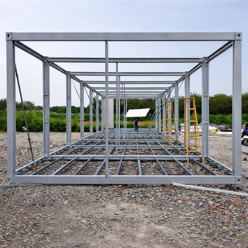 Durch die robuste Bauweise eignet sich der Stahlrahmen für langfristige Nutzung, modulare Erweiterungen und anspruchsvolle Einsatzbereiche. Die Konstruktion ermöglicht die einfache Integration von Sandwichpaneelen, Fenstern, Türen, Elektroinstallationen und Innenausbau.