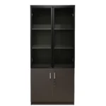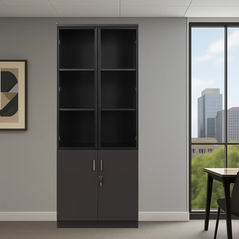 Die obere Schrankhälfte ist mit Aluminiumrahmen und transparenten Glastüren ausgestattet. Sie eignet sich perfekt zur Präsentation von Ordnern, Dokumenten, Büchern oder dekorativen Elementen. Alles bleibt sichtbar, ordentlich organisiert und gleichzeitig geschützt.