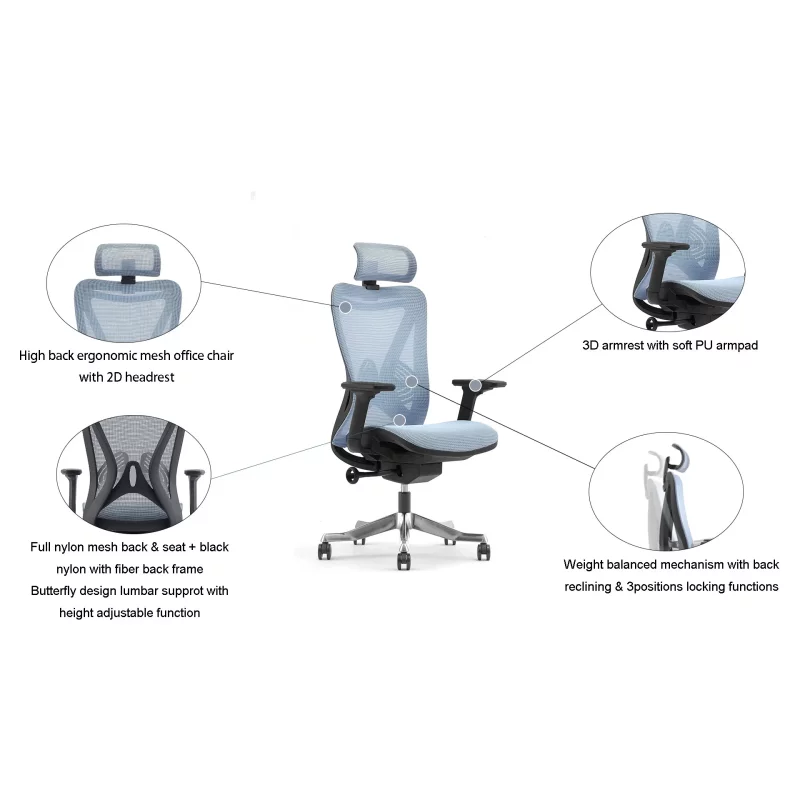 Ergonomischer Bürostuhl Voll-Mesh – Verstellbare Lordosenstütze, Kopfstütze & 3D-Armlehnen mit Aluminiumfuß