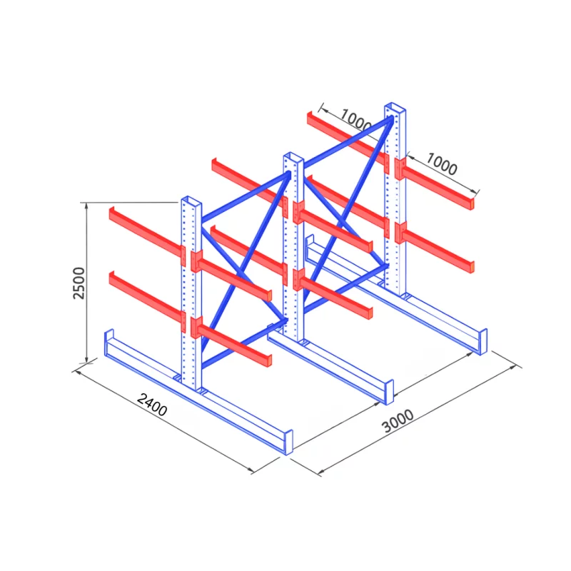 Doppelseitiges Kragarmregal 5000×2200×3000 mm – Schwerlastregal für Langgut – 1500 kg pro Ebene – robust, modular & CE-zertifiziert (Blau)