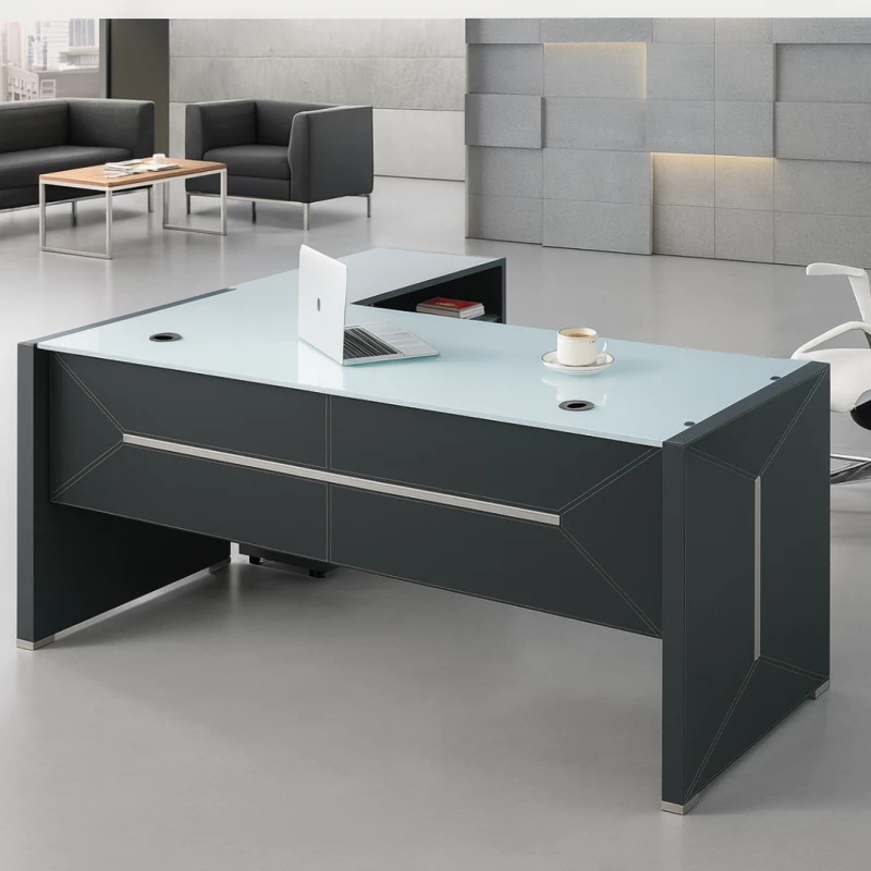 Dieser exklusive Manager Schreibtisch 1800 × 800 × 750 mm vereint modernes Executive-Design mit hochwertigen Materialien und funktionaler Büroarchitektur. Die Kombination aus 12 mm ESG-Sicherheitsglasplatte, PU-beschichteten Melaminpaneelen und Edelstahl-Standfüßen macht diesen Schreibtisch zur idealen Lösung für Geschäftsführerbüros, Managementbereiche und repräsentative Empfangszonen.
