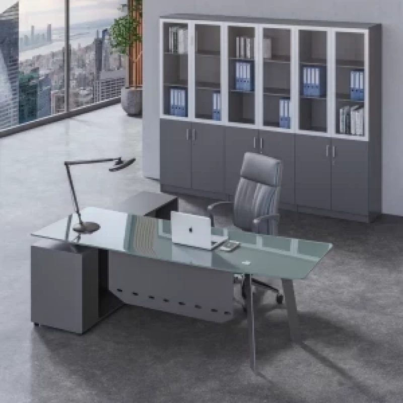 Manager Schreibtisch 1600×800 cm mit 12 mm ESG-Glas & Sideboard – Moderner Executive Bürotisch in Grau