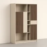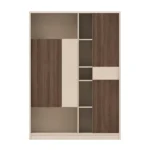 Gefertigt aus strapazierfähigem Melamin-beschichtetem Holzwerkstoff (Spanplatte), bietet der Schrank eine hohe Widerstandsfähigkeit gegen Kratzer, Abrieb und Feuchtigkeit. Die harmonische Kombination aus warmen Holzdekoren und hellen Kontrastelementen verleiht dem Möbelstück eine zeitgemäße, repräsentative Optik.