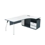 Diese Kombination ermöglicht eine strukturierte Organisation von Dokumenten, Ordnern, Bürozubehör und persönlichen Gegenständen. Das Sideboard ist konstruktiv fest mit dem Tisch verbunden und sorgt zusätzlich für strukturelle Stabilität.