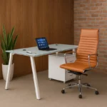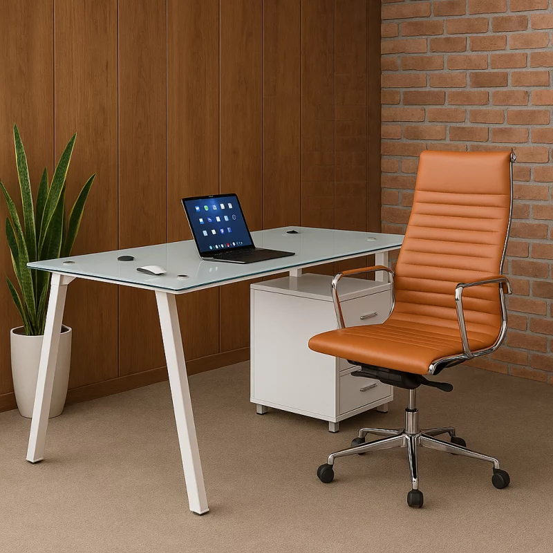 Design-Büroset mit Glas-Schreibtisch und ergonomischem Chefsessel – Stil trifft Komfort