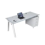 1. Schreibtisch mit Glasarbeitsplatte & festem Rollcontainer