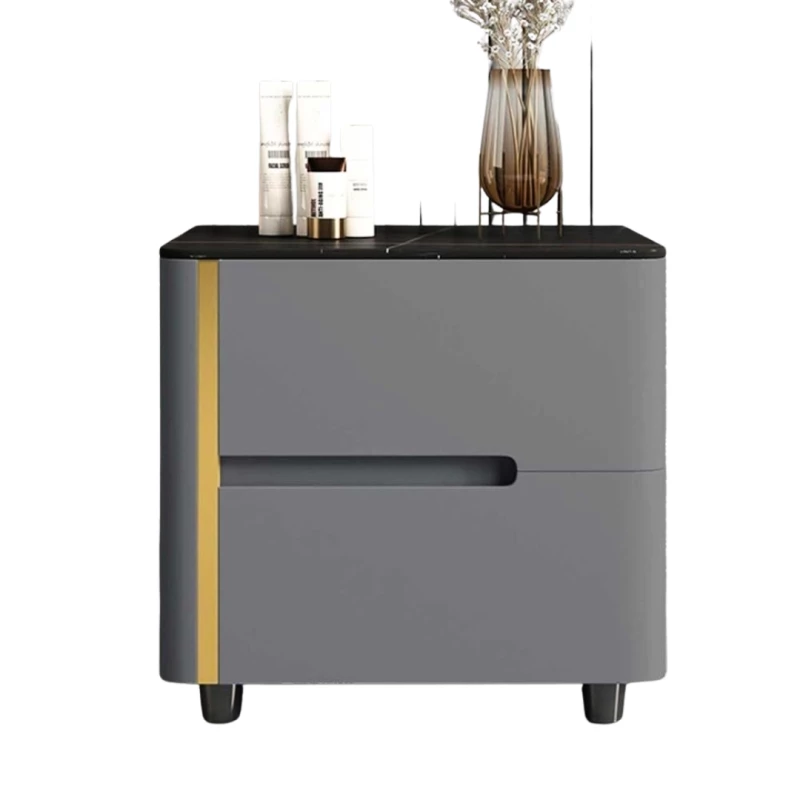 Moderne Nachtkommode aus Sinterstein, Eiche & Metall – Design Nachttisch Grau 50x40x50 cm