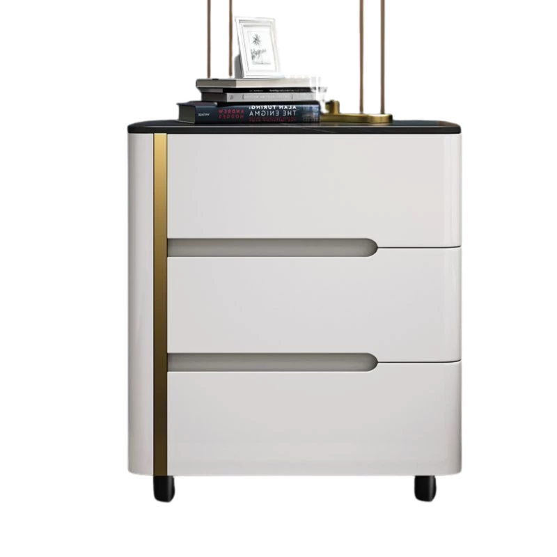 Moderne Nachtkommode Weiß mit 3 Schubladen – Sinterstein, Eiche & Metall 50x40x68 cm