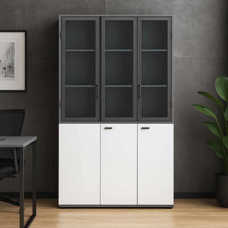 Moderner Aktenschrank mit 3 Türen & Glasaufsatz 120x40x200 cm – Büroschrank aus Melamin mit Aluminiumrahmen