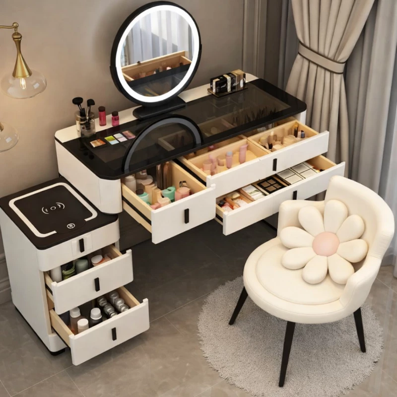 AURORA & PEARL Schminktisch-Set mit LED-Spiegel, Wireless Charging & Komfortstuhl – 120 × 40 × 120 cm