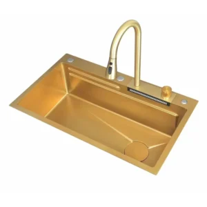 Die moderne multifunktionale Küchenspüle in Gold vereint luxuriöses Design, innovative Technik und maximale Funktionalität. Gefertigt aus hochwertigem Edelstahl mit eleganter PVD-Goldbeschichtung, wird dieses Spülbecken zum stilvollen Highlight jeder modernen Küche.