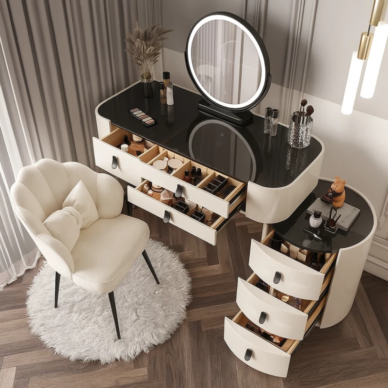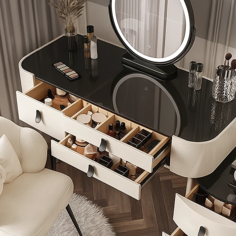 Die Glasoberfläche verleiht dem Schminktisch eine moderne, luxuriöse Ausstrahlung.