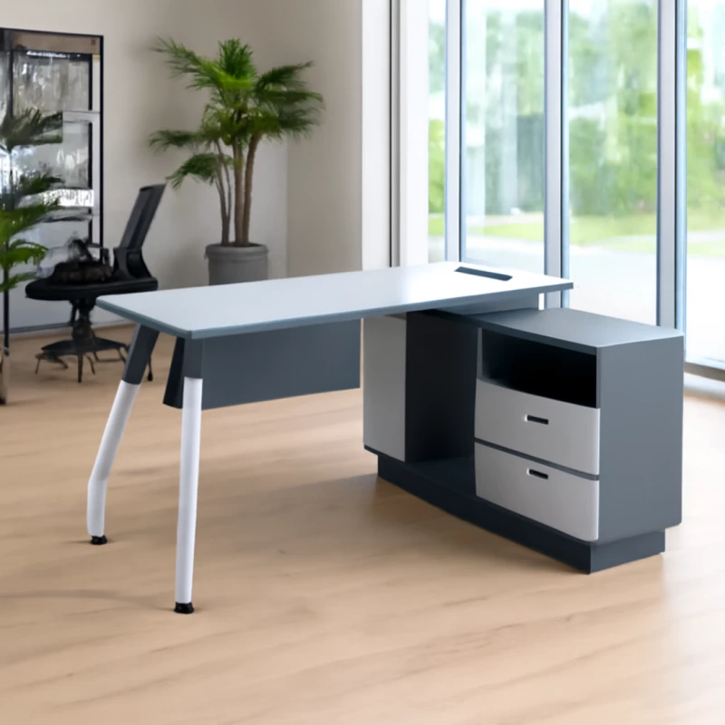 Der Schreibtisch verfügt über einen fest montierten Seitenschrank mit den Maßen 1200 × 600 mm, der funktionalen Stauraum bietet, ohne zusätzliche Möbelstücke zu benötigen.