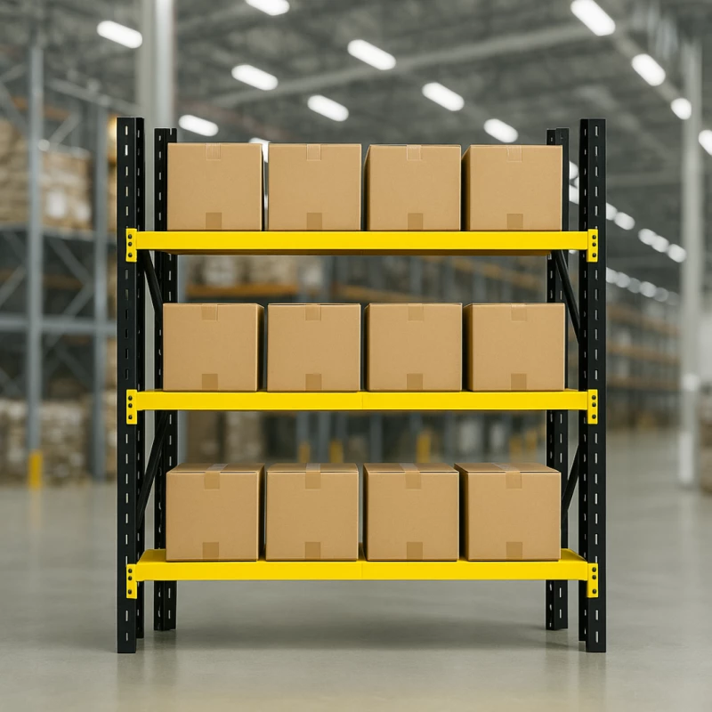 Dieses Schwerlastregal aus Metall ist eine robuste und langlebige Lagerlösung für die strukturierte Aufbewahrung von Werkzeugen, Kartons und Materialien in Lagern, Werkstätten, Garagen und gewerblichen Räumen.