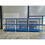 Jede Ebene besteht aus drei Regalböden, insgesamt 9 Regalböden, gefertigt aus verzinktem Stahlblech und zusätzlich pulverbeschichtet. Diese Kombination sorgt für sehr hohe Korrosionsbeständigkeit, Kratzfestigkeit und eine lange Lebensdauer.