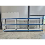 Jede Ebene setzt sich aus drei Regalböden zusammen – insgesamt 9 Regalböden –, gefertigt aus verzinktem Stahlblech und zusätzlich pulverbeschichtet.