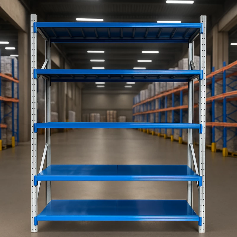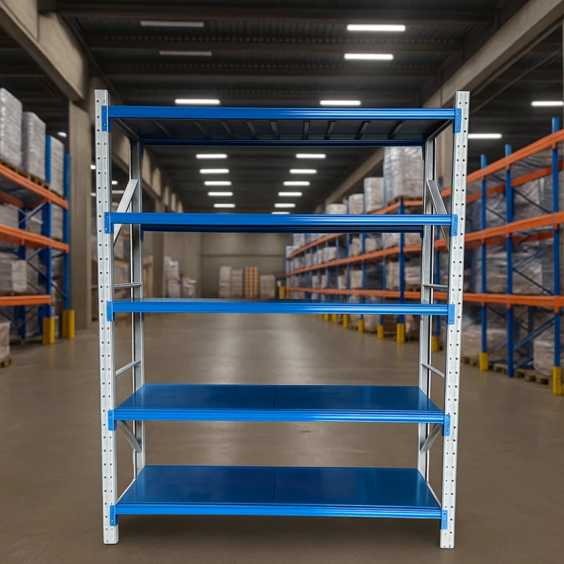 Schwerlastregal aus Stahl – 1500 x 500 x 2000 mm – 4 Ebenen – 400 kg Tragkraft – verzinkt & blau pulverbeschichtet