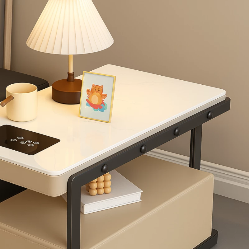 Gefertigt aus hochwertigen Materialien wie Sicherheitsglas, gesintertem Stein, PU-Leder, Sperrholz und Stahl, überzeugt dieser Nachttisch durch Langlebigkeit, Stabilität und eine edle Optik. Die widerstandsfähige Oberfläche ist kratzfest und leicht zu reinigen, während die Metallakzente dem Möbelstück einen modernen Charakter verleihen.
