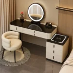 Dieser intelligente Schminktisch kombiniert modernes Design mit praktischer Technologie und bietet eine elegante Lösung für Ihre tägliche Beauty-Routine. Der runde LED-Spiegel mit Touch-Steuerung ermöglicht die Anpassung von Lichtfarbe und Helligkeit für perfekte Sichtverhältnisse zu jeder Tageszeit.