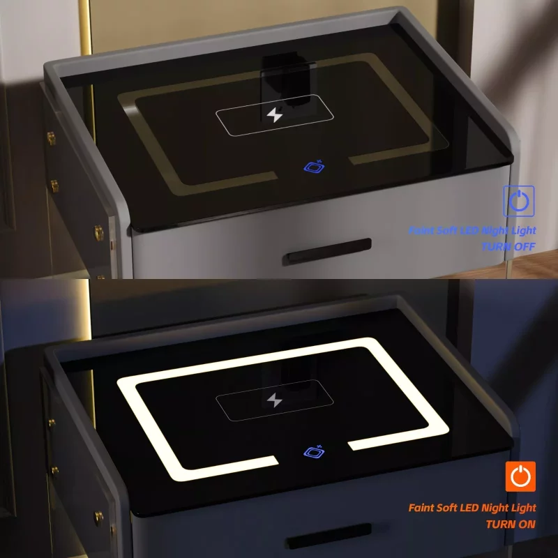 Intelligenter Nachttisch Weiß mit Wireless Charging 15W, LED-Beleuchtung, Nachtlichtsensor, 2 Schubladen & Codeschloss