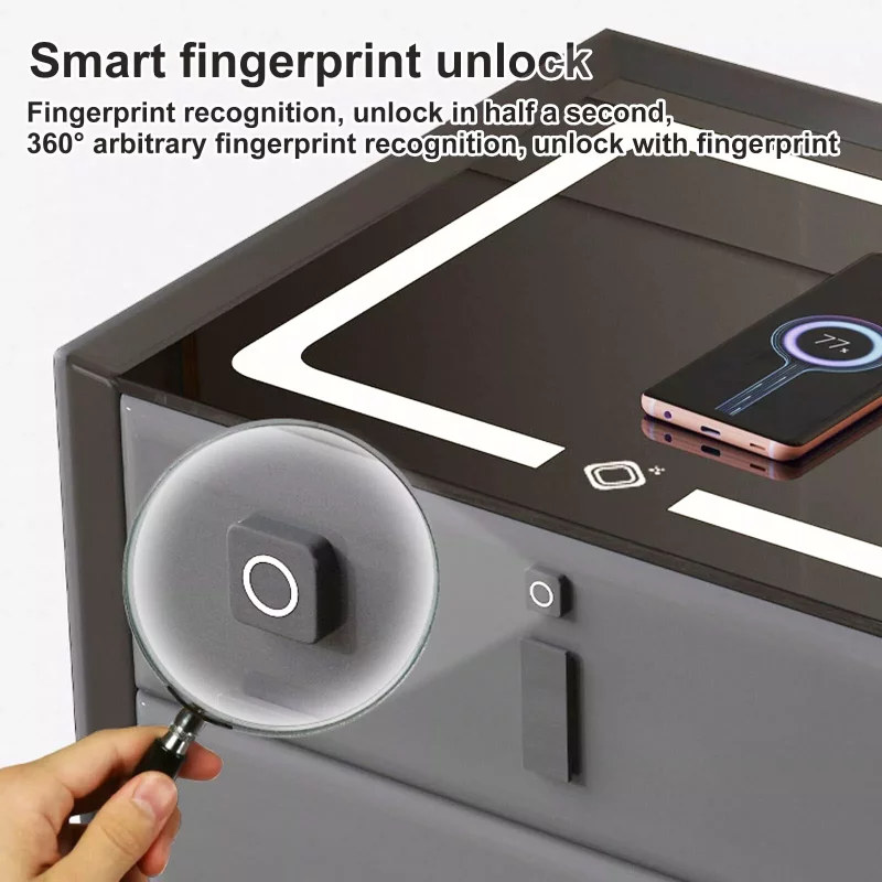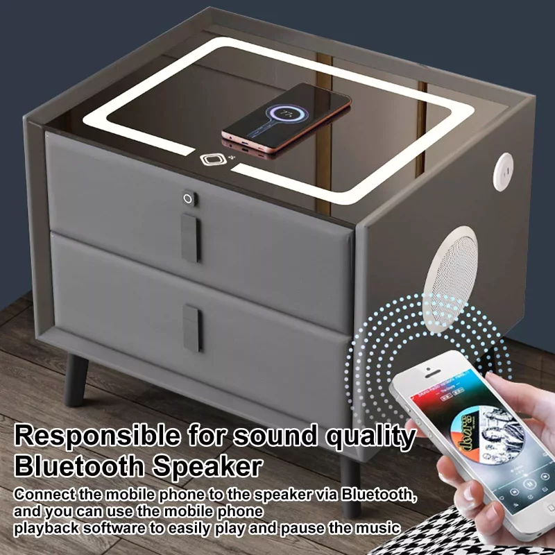 Der integrierte Bluetooth-Lautsprecher (10 W) sorgt für klaren, ausgewogenen Klang. Das Fingerabdruck-Sicherheitssystem schützt Ihre persönlichen Gegenstände zuverlässig. Dank zwei geräumiger Schubladen bleibt alles ordentlich und griffbereit.