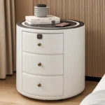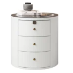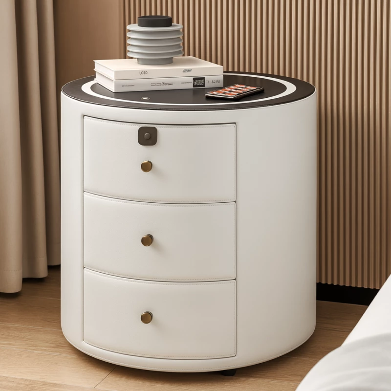Dieser smarte Nachttisch mit kabelloser Qi-Ladefunktion (Qi Wireless Charging) vereint elegantes, rundes Design in zeitlosem Weiß mit moderner Technologie. Die hochwertige Oberfläche aus Sicherheitsglas wird von einer integrierten LED-RGB-Beleuchtung mit drei Farben umrahmt und sorgt für eine stilvolle Lichtatmosphäre im Schlafzimmer.