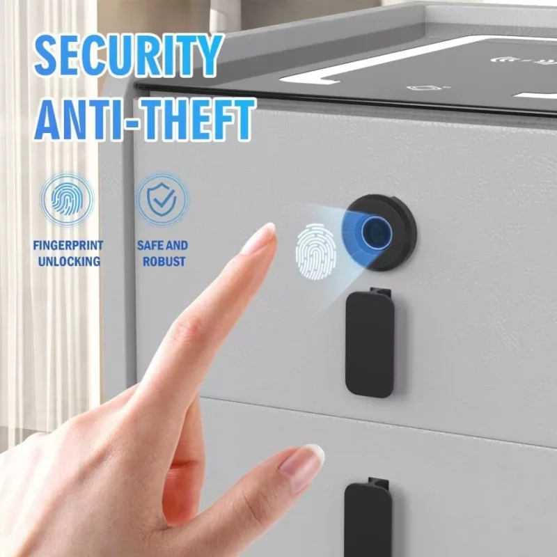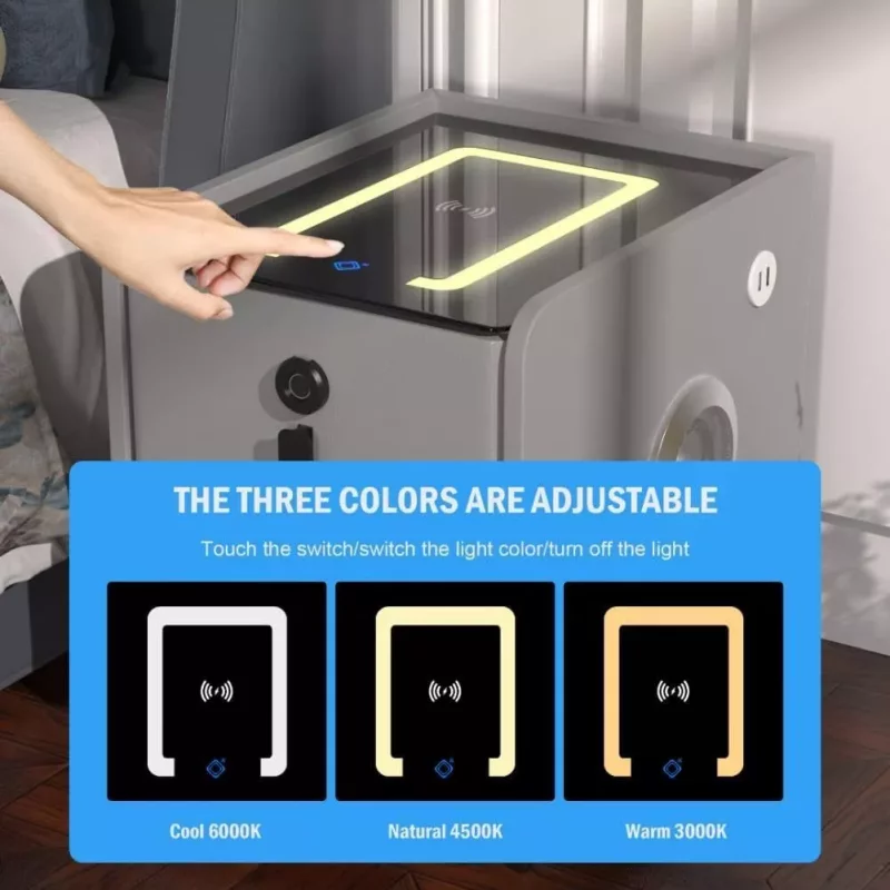 Für zusätzliche Sicherheit ist der Nachttisch mit einem Fingerabdruck-Schloss ausgestattet, das persönliche Gegenstände zuverlässig schützt. Zwei geräumige Schubladen bieten praktischen Stauraum für Alltagsgegenstände, Accessoires oder elektronische Geräte.